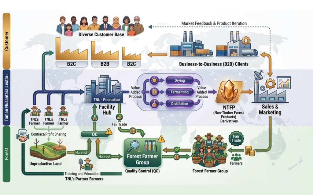 Non-Timber Forest Products (NTFPs) encompass all biological materials derived from forests—excluding commercial timber—such as resins, coffee, cacao, honey, and essential oils. In Indonesia, these products are the lifeblood of local and indigenous communities, providing a sustainable economy that does not require the felling of trees. By shifting the economic value of the forest from its wood to its recurring natural yields, NTFPs create a powerful incentive for “standing forest” conservation; communities become the primary guardians against illegal logging and land conversion to protect their own livelihoods.