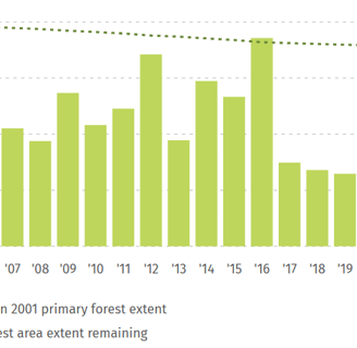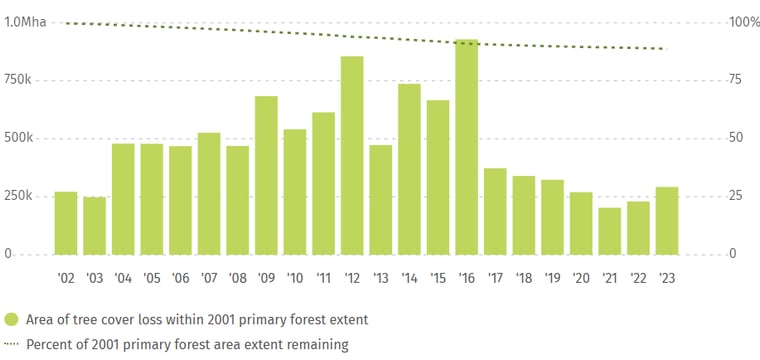 From 2002 to 2023, Indonesia lost 10.5 Mha of humid primary forest, making up 35% of its total tree cover loss in the same time period. Total area of humid primary forest in Indonesia decreased by 11% in this time period.